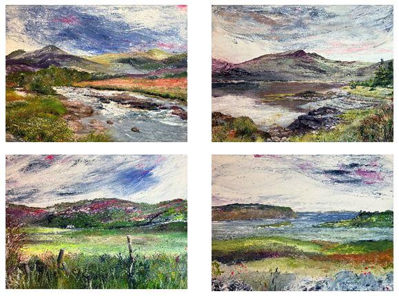 Below, clockwise from top left we have Big Burn (that's B-u-r-n!); Pennyghael; Gribun and Ben Na Drise, which are all 40cm x 30cm, acrylic on canvas, available for £200 each, unframed.