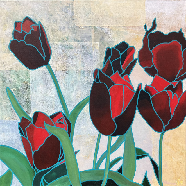 Structured & stylised tulips on a shabby chic background inspired by ancient walled gardens.